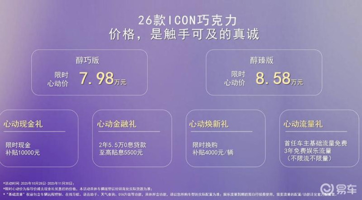 易车讯10月28日,吉利官方宣布2026款吉利ICON巧克力新车型迎来正式上市,售价区间8.98-9.58万元,现金补贴后限时心动价7.98-8.58万元。新车最大的亮点是新增了全新心动紫车色。此外,新车将搭载1.5T发动机和7速双离合变速箱组成的动力总成。